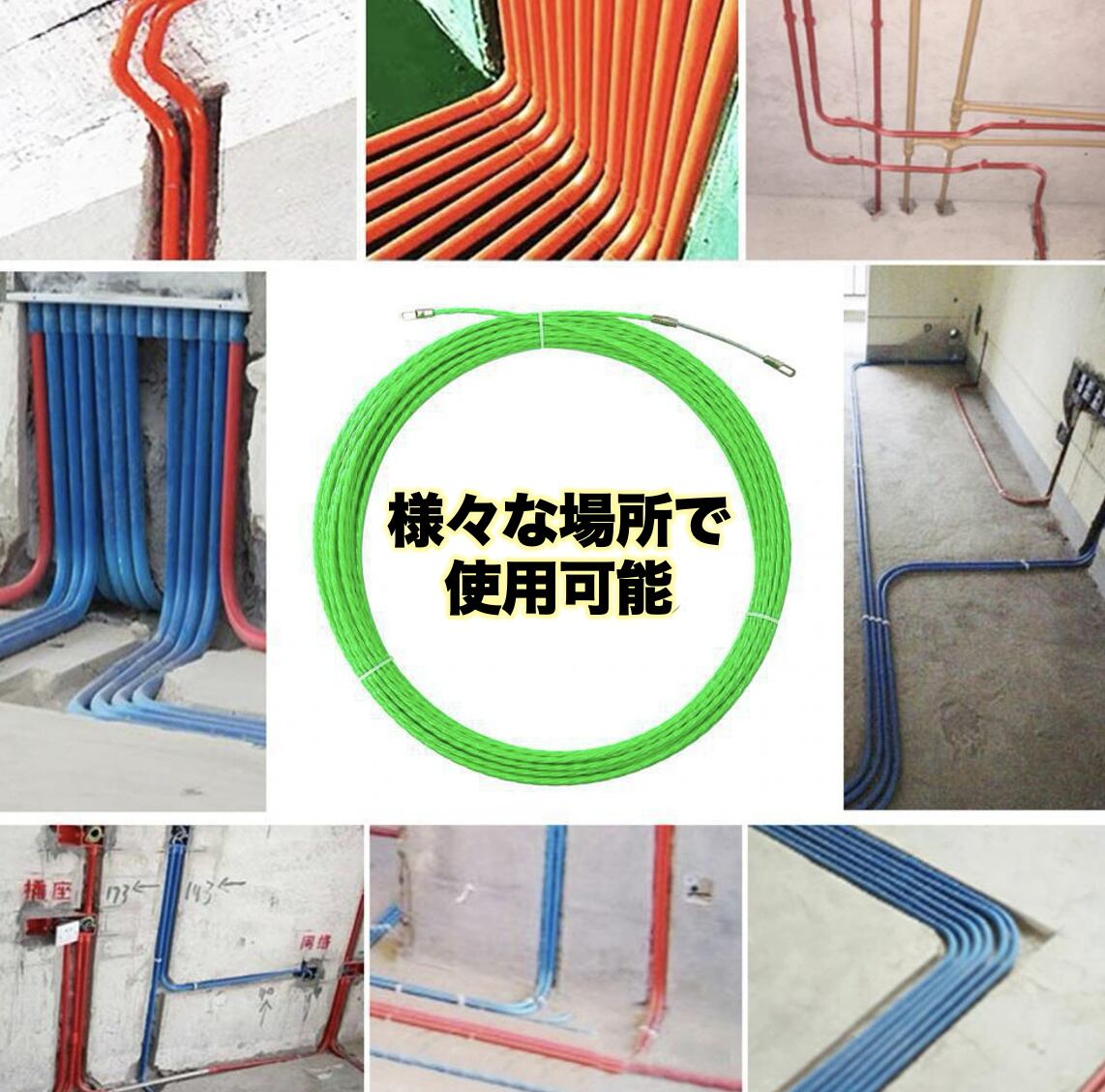 曲がり角の多い配管でも扱いやすい通線ワイヤーです。ロープ部分は三本編み構造で柔らかさと押しやすさを両立し、樹脂被覆により摩擦が少なく滑らかに進みます。先端は約10cmのばね構造でゆるいカーブにしっかり対応し、スムーズに方向を変えながら進める設計です。ステンレス製の先端金具を採用しており、水回り付近でも扱いやすい仕様です。長さは5mから50mまで選べ、家庭内の短距離配線から大型設備の長距離配線まで幅広く使用できます。CD管、PF管など多様な配管に適しており、電気工事、通信工事、DIYなどさまざまな現場で役立つ通線工具です。