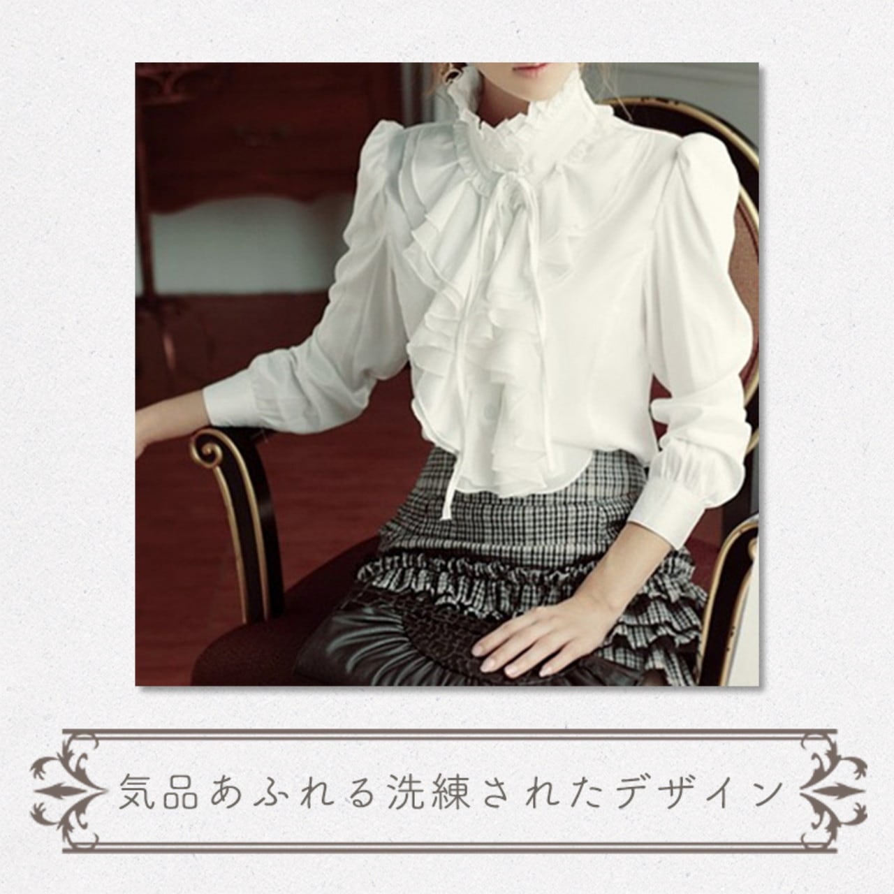 胸元にあしらわれた立体的なフリルと、ハイネックに合わせた細いリボンが女性らしい印象を作るフリルブラウスです。軽やかなシフォン風素材を使用し、動くたびに柔らかく揺れる表情がコーデに上品な雰囲気を添えます。ホワイトカラーは顔周りを明るく見せ、スカートにもパンツにも合わせやすい万能カラーです。入学式、卒業式、発表会、オフィスなど、きちんと感が求められる場面から普段使いまで幅広く活躍します。袖口のカフス仕様や立体裁断で整えたシルエットなど、細部まで丁寧に仕上げられており、ボトムインでもアウトでもきれいに見えるバランスに設計されています。軽量で扱いやすい素材のため、長い季節にわたり快適に着用できる一枚です。年齢を問わず取り入れやすく、贈り物としても使いやすい上品なブラウスです。