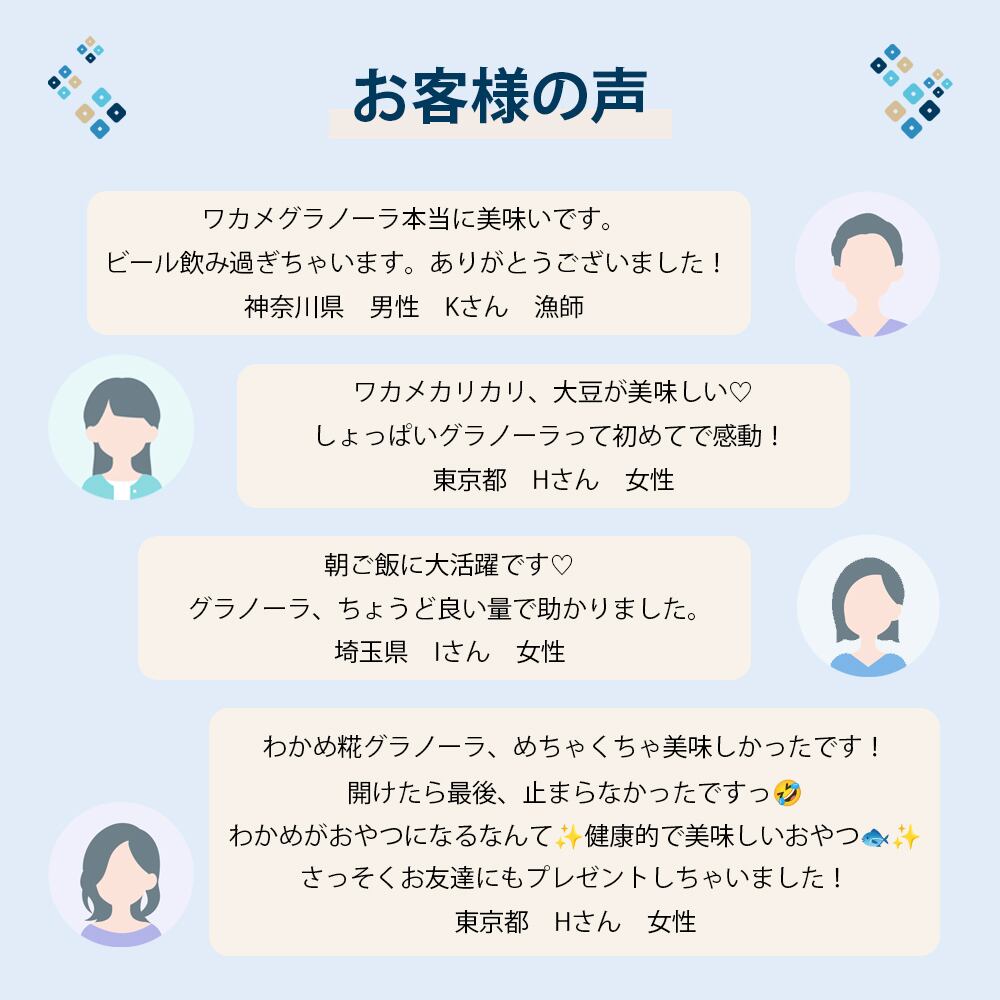 神奈川県・横須賀市の観音崎産わかめを使用した、唯一無二のグラノーラ。海藻の豊富なミネラルと食物繊維が腸内環境をサポートし、毎日の腸活にぴったりです。さらに、仙台産の米糀を用いることで、砂糖不使用ながら自然な甘みを引き出し、糖質オフと美味しさの両立を実現しました。
