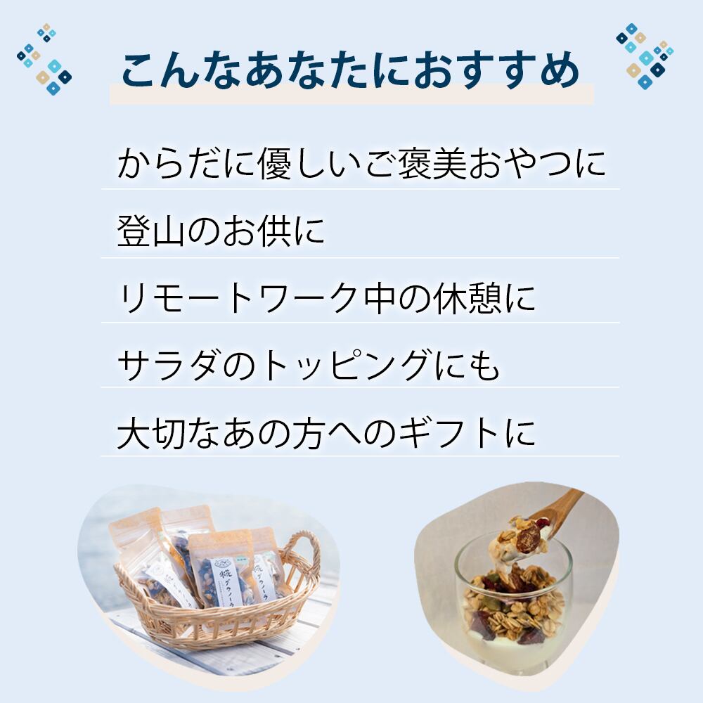 甘さ控えめで、大人のおやつとして最適。**ビールやワインとの相性も良く、リモートワークや登山、アウトドアシーンにもぴったり。**また、朝食用のグラノーラやヨーグルトのトッピング、ナッツバーの材料としても幅広くご活用いただけます。