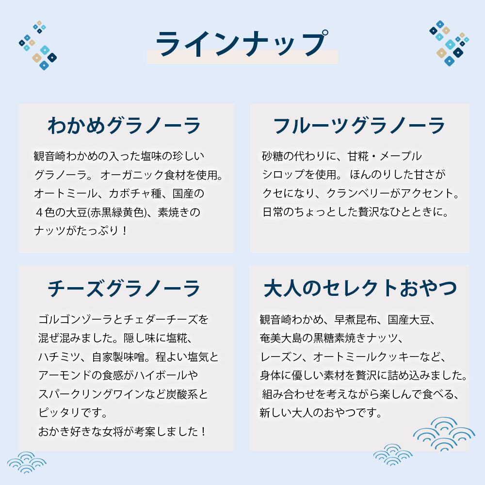 神奈川県・横須賀市の観音崎産わかめを使用した、唯一無二のグラノーラ。海藻の豊富なミネラルと食物繊維が腸内環境をサポートし、毎日の腸活にぴったりです。さらに、仙台産の米糀を用いることで、砂糖不使用ながら自然な甘みを引き出し、糖質オフと美味しさの両立を実現しました。