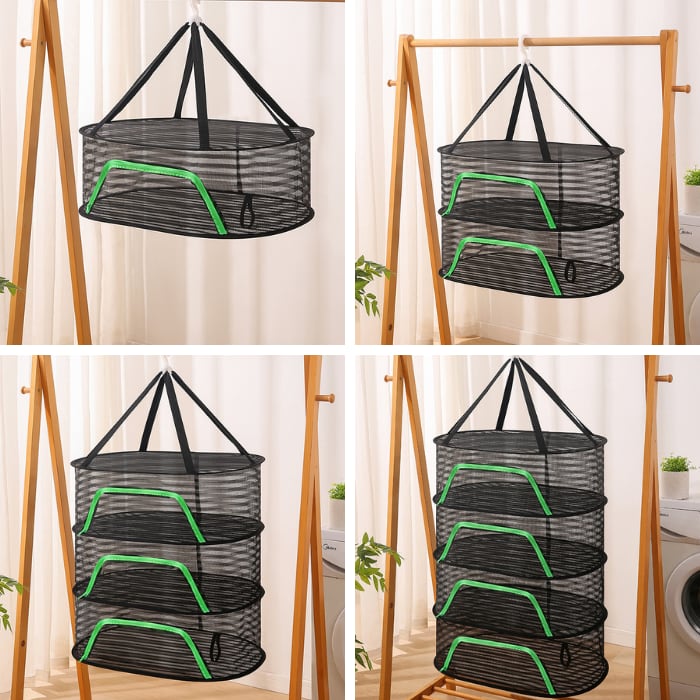 本製品は型崩れしやすい衣類を平置きした状態で乾かせる吊り下げ式乾燥ネットです。通気性の高いメッシュ構造で湿気がこもりにくく、屋内外で快適に使用できます。360度回転フック採用で設置後の角度調整ができ、省スペースで効率よく乾燥可能です。段数選択式で衣類、小物、食品など分けて干せるため用途の幅が広がります。前面にはジッパーを採用し、乾燥中に落下しにくく、食品乾燥にも対応しています。折りたたみ式で約21cmまでコンパクト収納でき、持ち運びにも便利です。耐荷重約5kgで厚手衣類やまとめ洗いにも使えます。洗濯、調理、アウトドアに活用できる汎用性の高い乾燥ネットです。