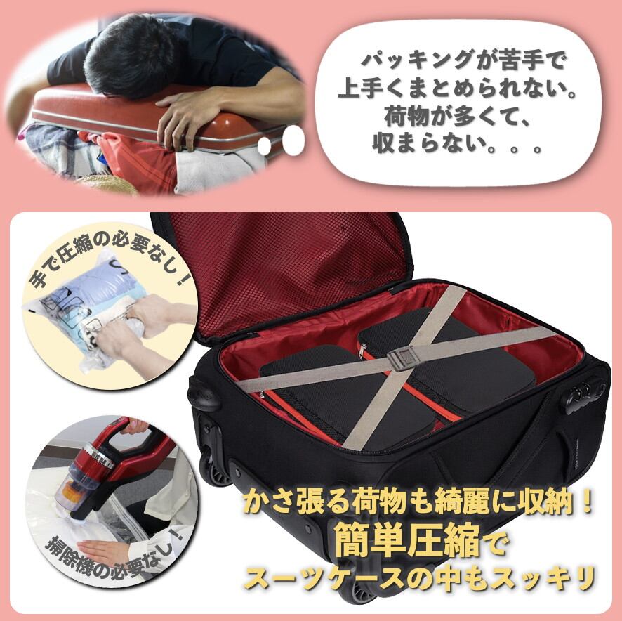 ファスナーを閉めるだけで、毎回の荷造り、パッキングでの収納の手間を省き、通常の圧縮袋と違い、吸引機は不要。ファスナーを閉めるだけで簡単に圧縮可能!かさばる衣類を楽に収納・圧縮・整理整頓ができ、20%〜最大50%の圧縮が可能となります。衣類をコンパクトに圧縮して収納できるため、コンパクトなサイズでスーツケースやバックパックのスペースを最大限に活用できます。