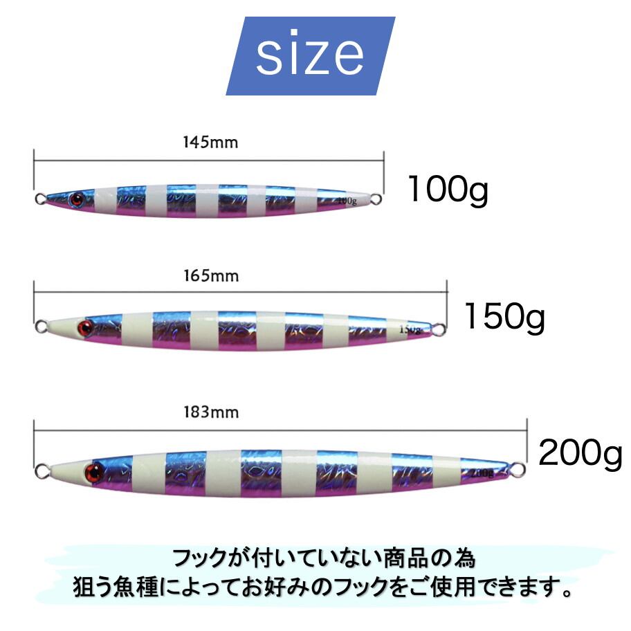 本製品は五色セットで構成されたメタルジグであり、ショアでもオフショアでも幅広い釣りに対応する構造となっています。重量は一〇〇gから四〇〇gまで六種類をそろえており、浅い場所や深い場所や潮が速いポイントでも使える自由度の高い構成です。ショアジギングではヒラメやシーバスや青物などを狙いやすく、オフショアでは大型魚や深場のターゲットも視野に入ります。ターゲットに合わせて最適な重さを選ぶことで釣り場の状況をより効率よく攻略できます。
