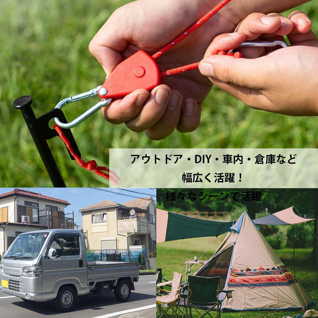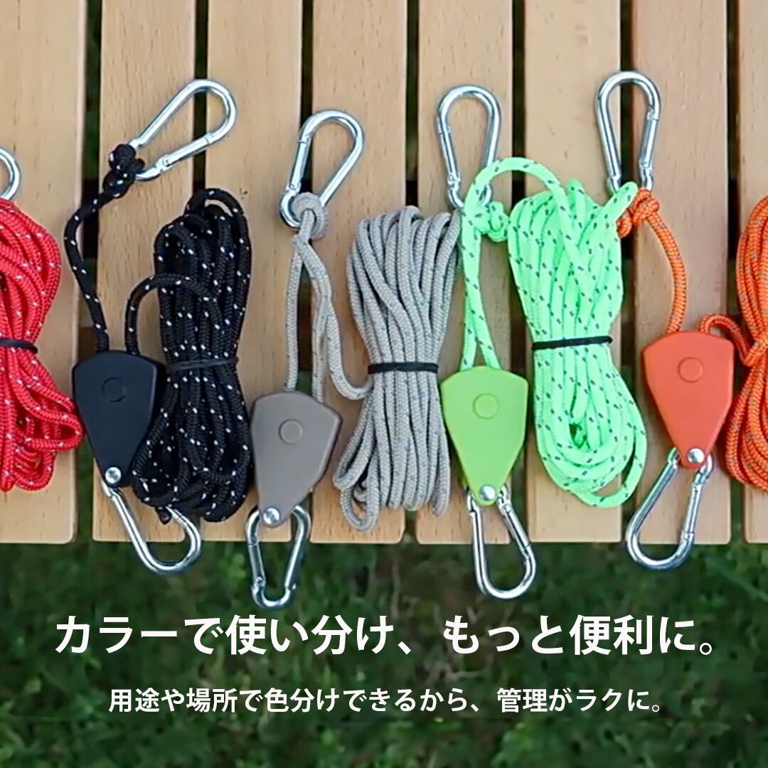 テントやタープの設営をスムーズにする「ロープラチェット4個セット」。カラビナをペグに掛けてロープを引くだけでしっかり固定でき、ロープワーク不要で初心者にも扱いやすい設計です。耐荷重約68kgの高強度仕様で、ランタンやギアの吊り下げにも対応。太さ約4mm・長さ約4mの丈夫なロープは摩擦や劣化に強く、蛍光塗料入りで夜間でも視認性抜群。軽量コンパクトで持ち運びや収納も簡単。テント、タープ、洗濯ロープ、DIYなど多用途に活躍し、キャンプから日常まで幅広く使える便利アイテムです。カーキ、グリーン、オレンジ、ブラック、レッドの5色展開で、おしゃれに機能性をプラスします。