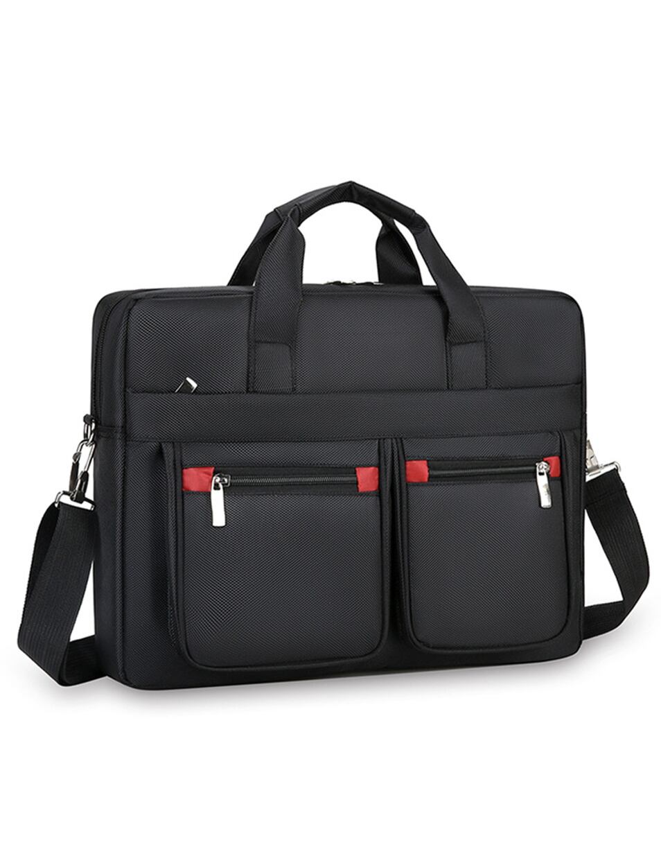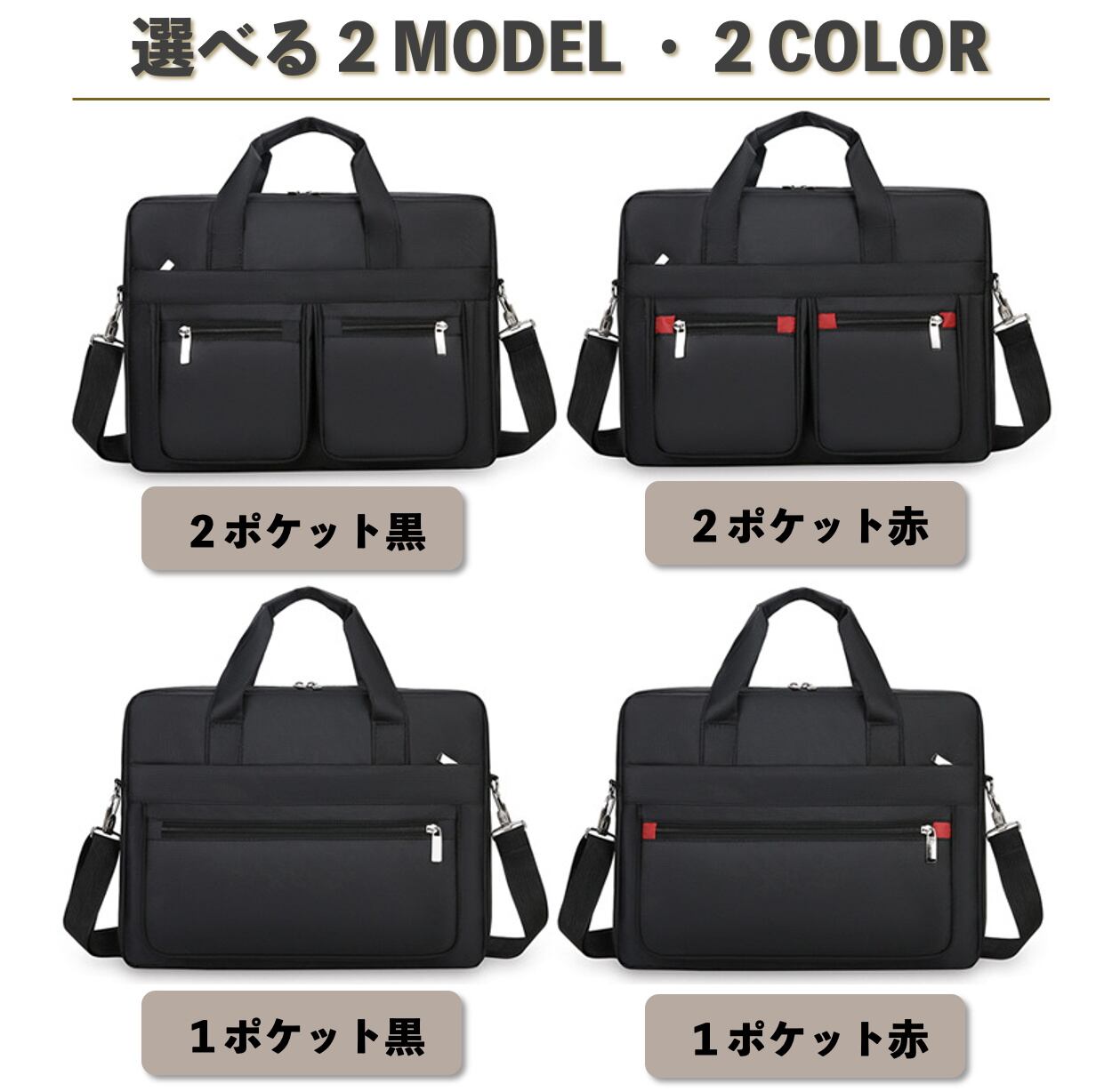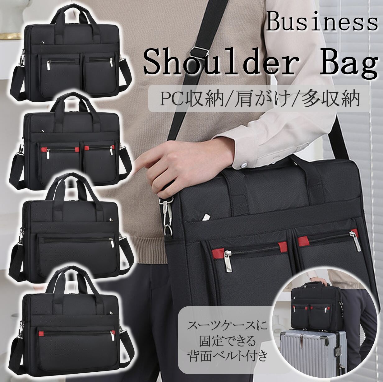 持ち方は手提げとショルダーの2WAY仕様で、付属のショルダーベルトを使えば肩掛けや斜め掛けにも対応します。背面にはキャリーケース固定用のベルトを配置しており、出張時の移動もスムーズです。
