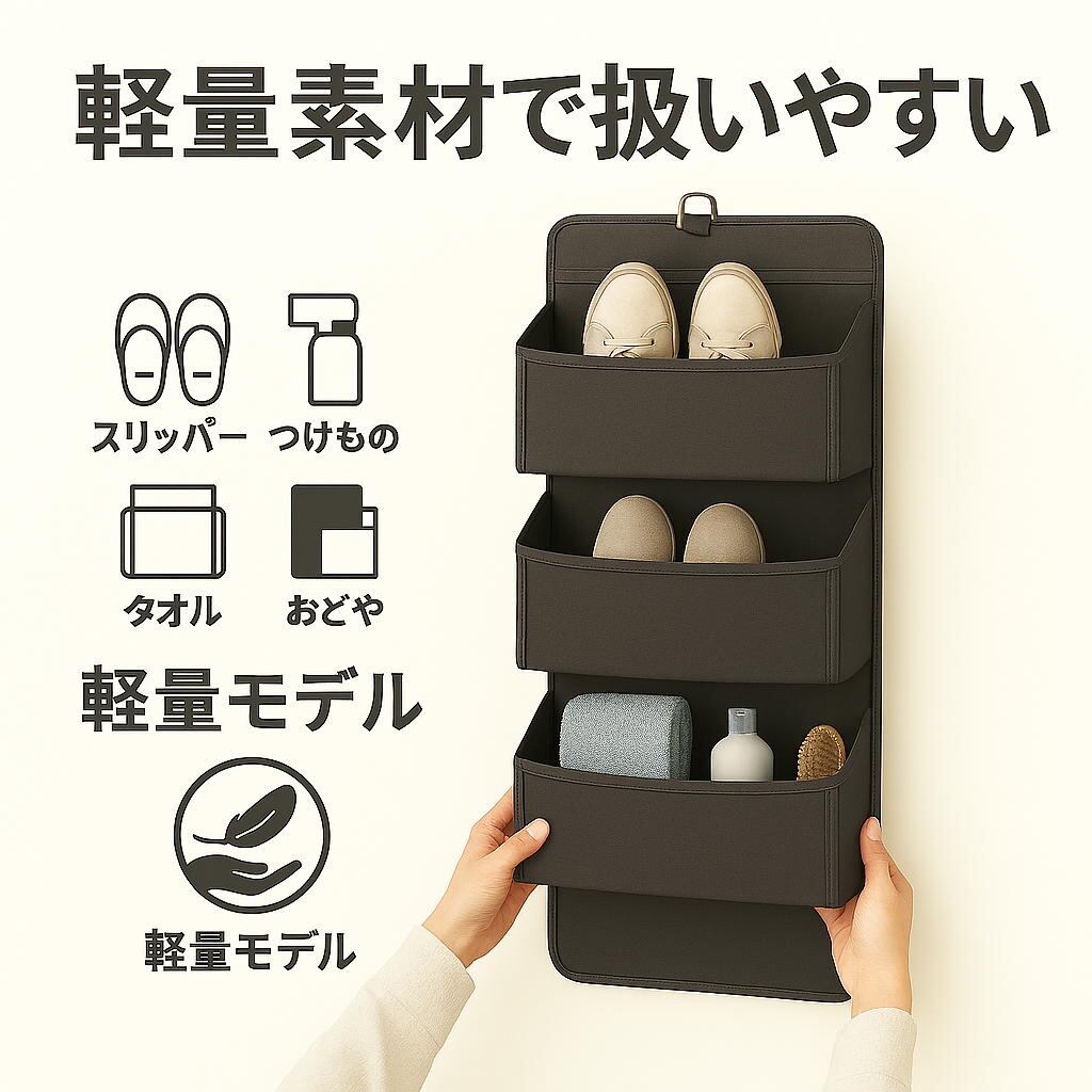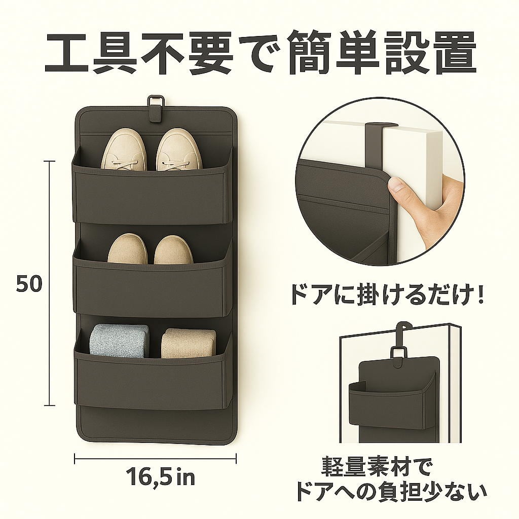 ドアに掛けるだけで使える吊り下げ式収納バッグです。多層ポケット構造により、靴や日用品を縦方向に整理でき、床や棚を使わず収納量を確保できます。折りたたみ可能で扱いやすく、玄関や室内、クローゼットなど設置場所を選びません。灰色・黒色の落ち着いたデザインで、層数や素材違いのバリエーションにも共通して使用できます。